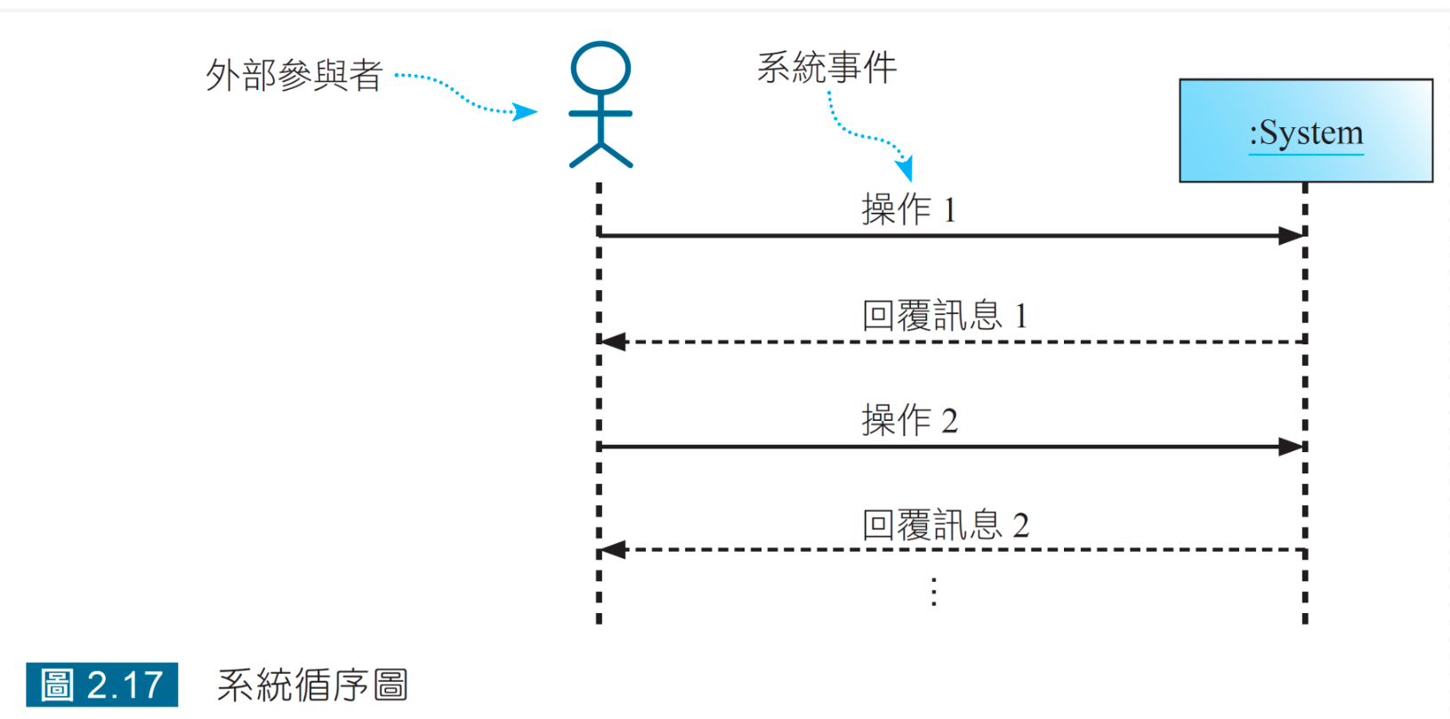 把系統看成一個黑箱,參與者要求系統進行工作 (系統事件),系統如何處理工作並回應訊息給參與者即可