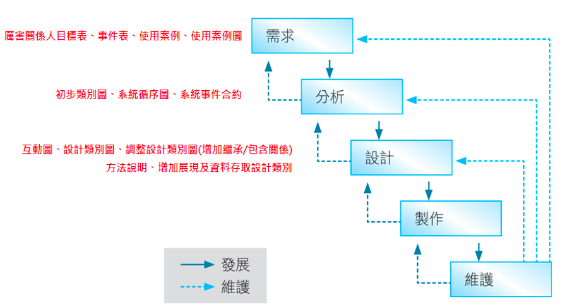 以個別使用案例為主設計出互動圖-->描繪設計類別圖-->明確說明每一方法之標示符號與演算法-->定義展現層和資料存取層