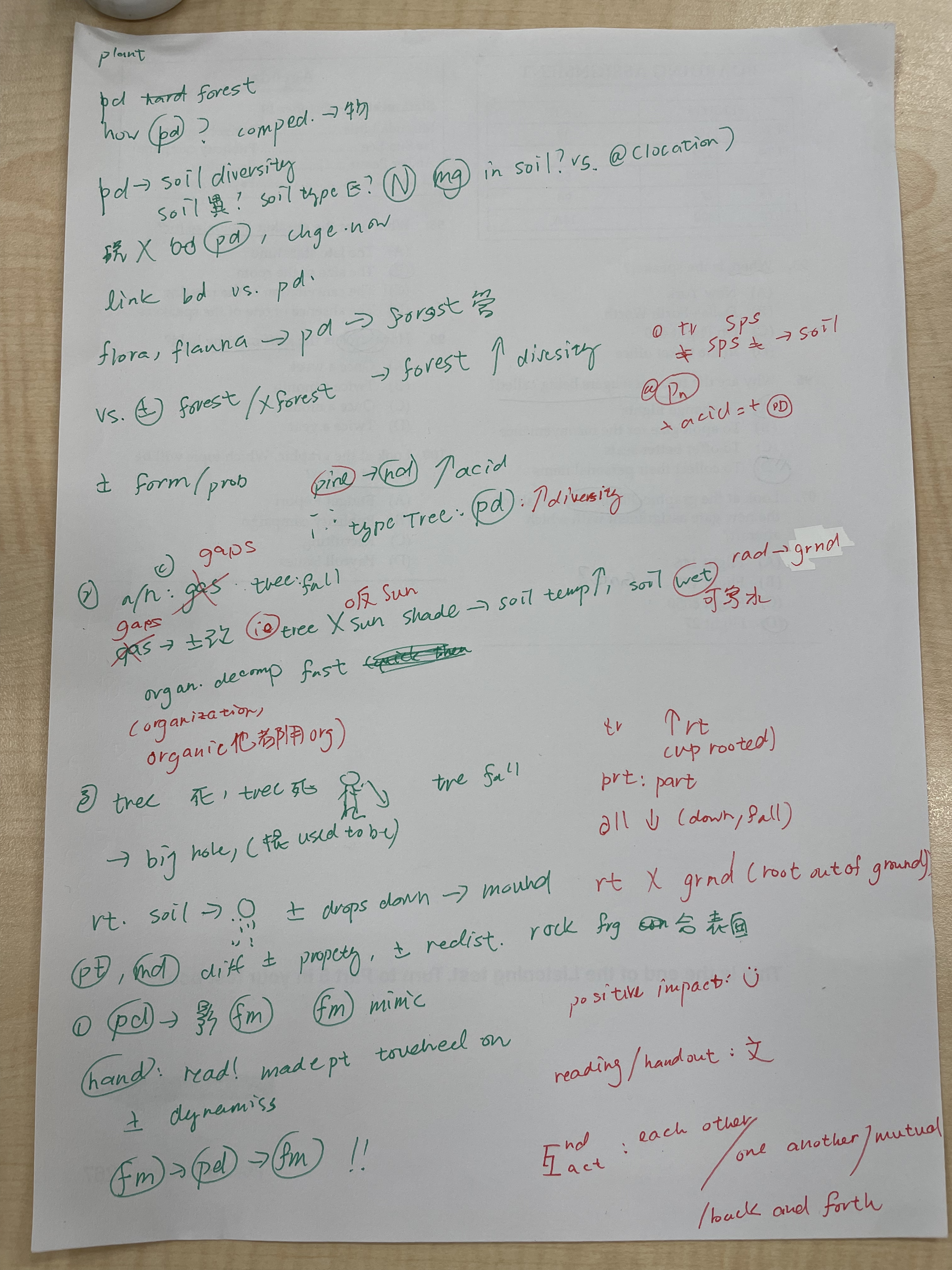 看notes時,要看題目位置在哪裡。 中(前、後)段的題目不會問文章前段…等等等,注意題目位置與文章位置。 第一題通常會是what is the conversation mainly about?,定位點就會是在第一段,而只有出現十分鐘的或是剛開始出現一下的,就是忽略就好,如今天所講的forest management選項,忽略。另外,你也要想該選項是否在你腦海中有印象?如forest growth他可能