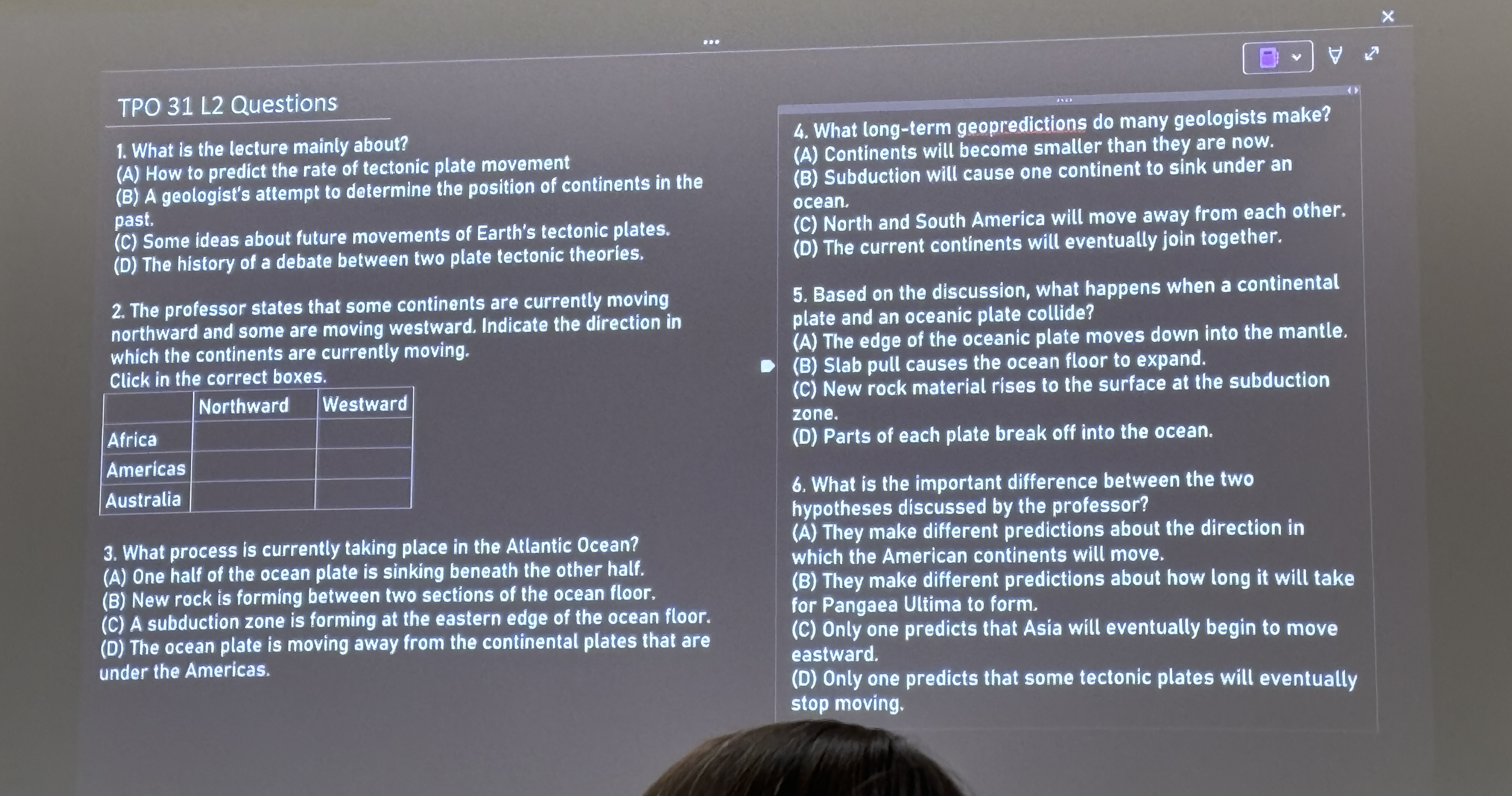 speculate: spec: see → inspect collide: lid: 蓋子 Lecture C A: N Americas:W Au: N B D(重點是join together) A (C. 可拿掉new rock, 儘管subduction zone,但new rock上一題已經用過)(重點是moves down) A (重點在direction)