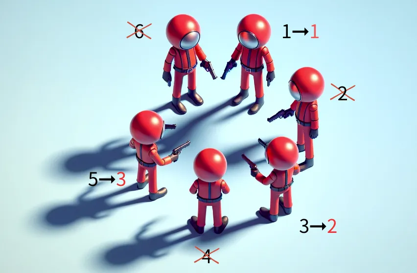 假設今天喊到2的人都要被處死,共有6個人,輪流喊「1!」「2!」 可以發現定律: